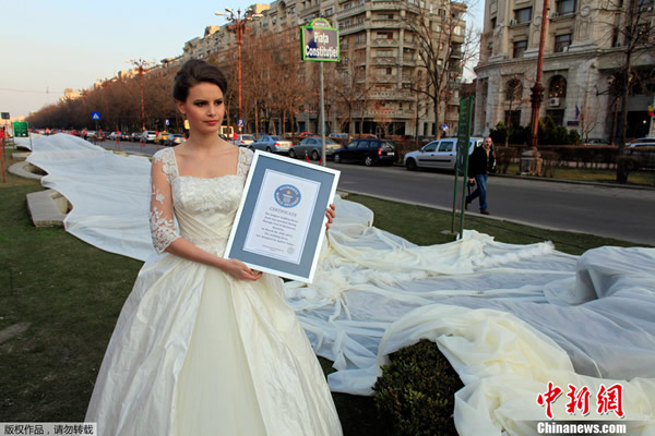 3月20日,罗马尼亚模特身披的1.85英里(约3000米)长婚纱裙摆创造新的吉尼斯世界纪录。这件婚纱和裙摆是10个裁缝用时100天精心缝制,共用了4700米塔夫绸、5.5米尚蒂伊蕾丝、45米内衬、1857根缝纫针和150轴线。蕾丝来自法国,其他材料来自意大利,造价5000英镑。