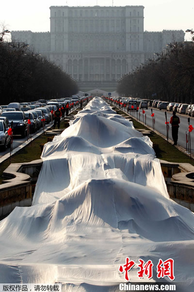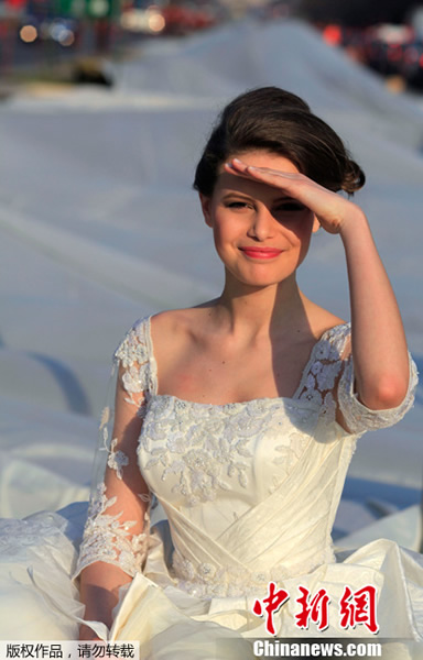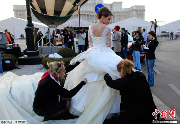 罗马尼亚模特身披3000米长婚纱裙摆创造新吉尼斯世界纪录