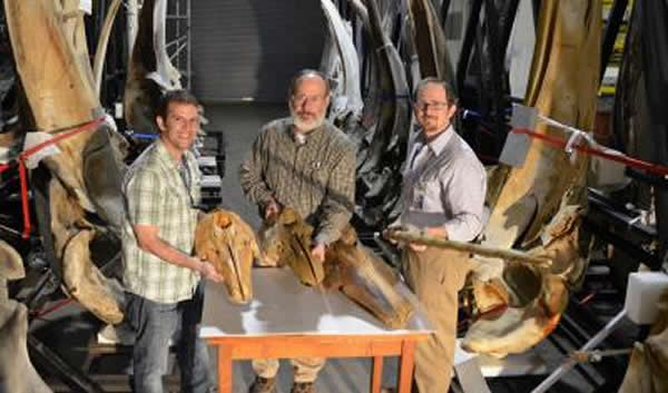 (从左至右) Jorge Velez-Juarbe拿着白鲸头骨,Dave Bohaska拿着似独角博哈斯卡鲸头骨,Nicholas Pyenson拿着独角头骨