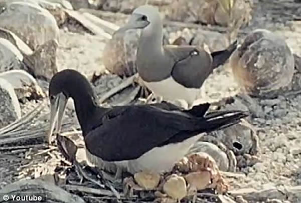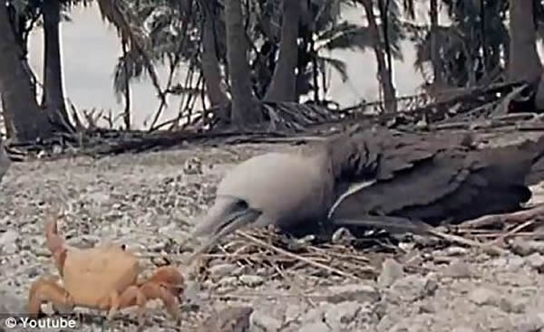 这段惊人视频以一群螃蟹袭击一个鲣鸟巢穴开始