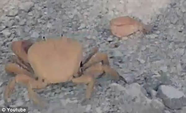 这只螃蟹和“队友”失散,遭到一只比它大许多的鲣鸟的猛烈攻击。