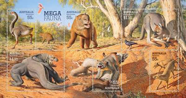 澳洲发行的更新世大型动物邮票,包括牛顿巨鸟、丽纹双门齿兽、巨袋鼠、巨蜥、袋狼和塔斯马尼亚虎