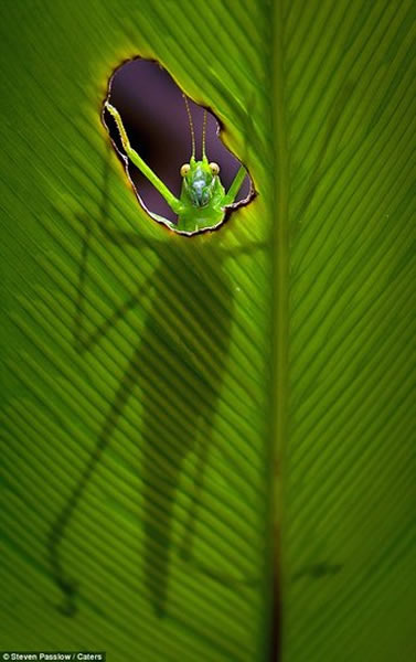 当它的小面孔从绿色叶片中窥探时呈现出一副吃惊的表情,这张照片是澳大利亚幽默摄影师史蒂芬-帕斯罗维(Steven Passlow)拍摄的,去年12月份,他在家中花园里观察到攀爬到绿叶上的蚱蜢,并抓拍下这一难得的场景。
