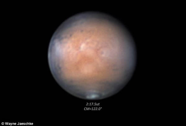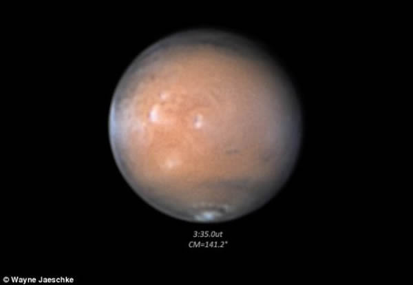 美国业余天文学家韦恩-贾斯切克拍摄了一组火星照片,所呈现的景象似乎是火星的云层。当时,这位家住宾夕法尼亚州韦斯特-切斯特的业余天文学家发现火星盘边缘升起怪异的云状物。