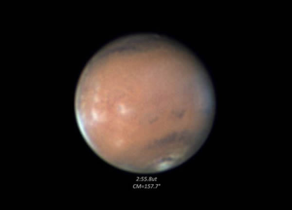 美国天文摄影爱好者在其位于宾夕法尼亚州韦斯特-切斯特的私人天文台拍摄的一幅火星照片,顶部是出现所谓怪云的区域放大两倍后的图片