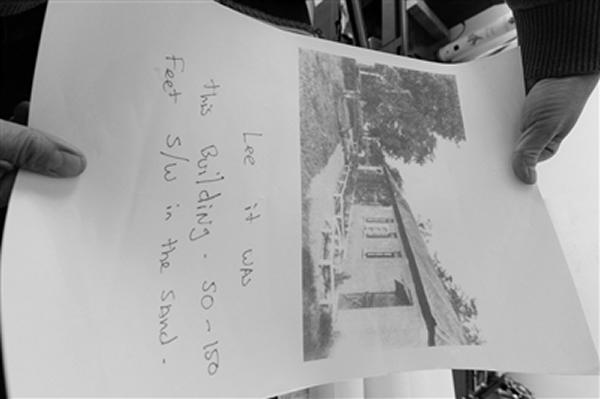 记者注意到,地图和手绘的位置图的尺寸都有1米见方,图上用红色标注的埋藏位置十分清晰,博文还在一张军营老照片下写道:“箱子就埋在这座建筑西南150英尺(约46米)处”。