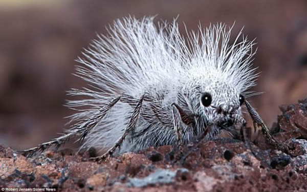 摄影师罗伯特-延森近日在美国加利福尼亚州莫哈韦沙漠中旅行时发现了一只长相怪异、小巧玲珑的小动物。这种动物全身长满了毛绒绒的白色毛发,好似一只惹人怜爱的小宠物。不过,人们需要小心的是,千万不要被它可爱的外观所迷惑,它的真名为蓟花冠毛蚁,又名为母牛杀手蚁。这种只有大约2.5厘米长的小动物,其实是一种无翼雌性黄蜂,它最可怕之处在于它惊人的杀伤力,只需要一根毒刺就可以将受害者放倒在地。