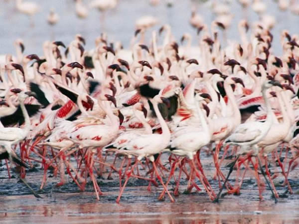 一群小火烈鸟聚集于博茨瓦纳乔贝河中。乔贝河穿越乔贝国家公园,该国家公园如今也是卡沙跨界自然保护区的一部分。在乔贝国家公园中,河流两岸到处都是各类野生动物,也为游客提供了许多近距离观看野生动物的机会。此外,乔贝国家公园中还有茂盛的草场、宽阔的洪泛平原以及树种多样的森林,其中包括相思树、猴面包树等著名树种。