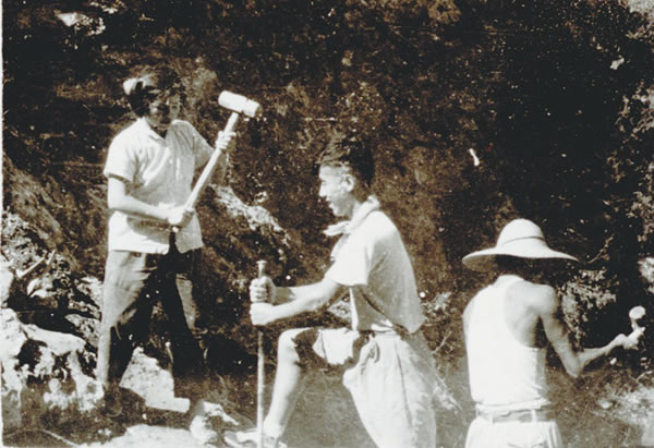 1958年在周口店实习期间,王仁波(中)、刘一曼(左)打炮眼炸山
