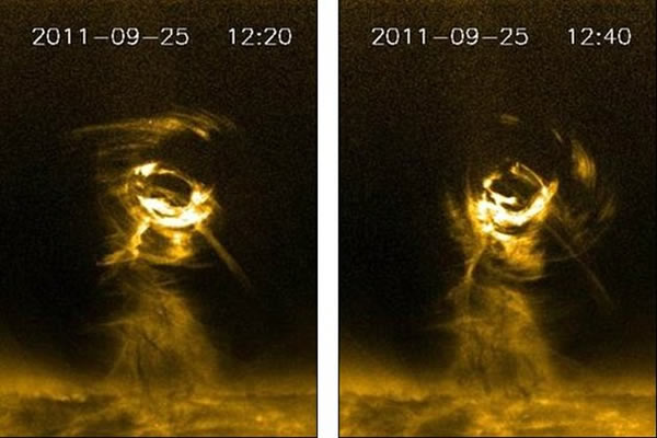 阿伯雷斯威斯大学的李新(音译)博士说:“这或许是第一次通过成像器观测到如此大规模的太阳风暴龙卷风。”从日珥吸积的炽热气体温度可高达5万-200万开氏温度,盘旋上升至较高大气层,至少3个小时移动20万公里。这一壮观太阳风暴龙卷风是于2011年9月25日观测到的。