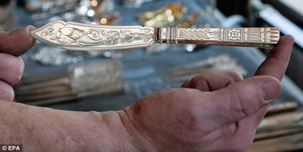 这把餐刀上雕刻着精美的鱼花纹,这些珍宝都被隐藏在地板下的暗室里
