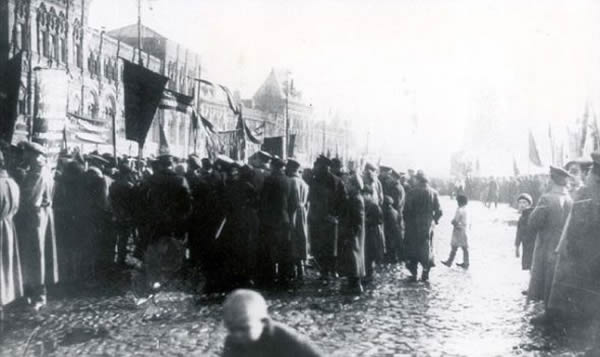 在布尔什维克执政之后展开国有化改革,这栋房屋被收归国有,这里被改建成了一家食堂。图为人们在十月革命胜利之后上街庆祝