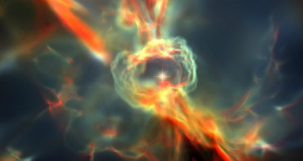 相关研究人员认为:创建宇宙演化虚拟场景是一件真正的乐事,因为今天的计算机和软件具有非常强大的功能,不久前我们完成了耗时数星期的一个虚拟场景制作,现在利用一个下午的时间还能再完成一个,这就是一个令人沉醉其中的环境。我们可以探索宇宙三维空间的数据,在宇宙学的数据中遨游是一中非常奇妙的感觉。图中显示了婴儿恒星点燃了一团稠密的氢气体云,并开始燃烧。