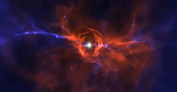 早期宇宙中诞生的第一批恒星质量是非常巨大的,可以通过对原始星系中蕴藏的氢使其电离,不断壮大自己。但这些恒星的生命周期很快便结束了,可谓是“英年早逝”,形成了蔚为可观的超新星爆发。斯坦福大学柯维里粒子天体物理学与宇宙学研究所的宇宙进化模拟器使用强大的计算机处理能力将观众们带入各种宇宙“暴力美学”中,如同身临其境。