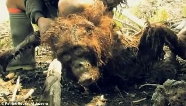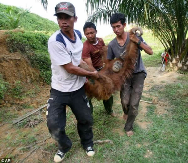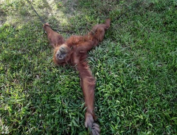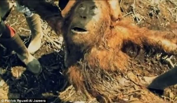 不幸的命运:在印度尼西亚苏门答腊岛,森林采伐摧毁了格林的雨林家园后,这只母猩猩从泥土中被拉了出来。