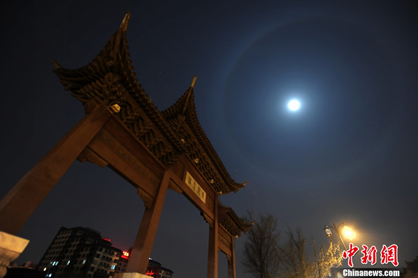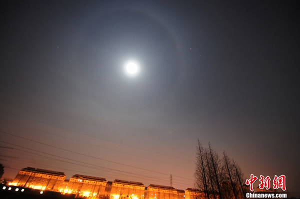 江苏扬州市区上空出现罕见的“月晕”现象 来源: 神秘的地球 时间:2012年4月06日 12:44 江苏扬州市区上空出现罕见的“月晕”现象 江苏扬州市区上空出现罕见的“月晕”现象 江苏扬州市区上空出现罕见的“月晕”现象 4月5日晚23时许,江苏扬州市区上空出现罕见的“月晕”现象,一个若隐若现的、大大的圆环罩在月亮周围,甚为壮观,整个过程持续1个多小时左右,据悉,月晕是月光经高空中的冰晶折射而形成的晕。 中新社发 孟德龙 摄 图片来源:CNSPHOTO 上一篇 下一篇 TAG: 月晕
