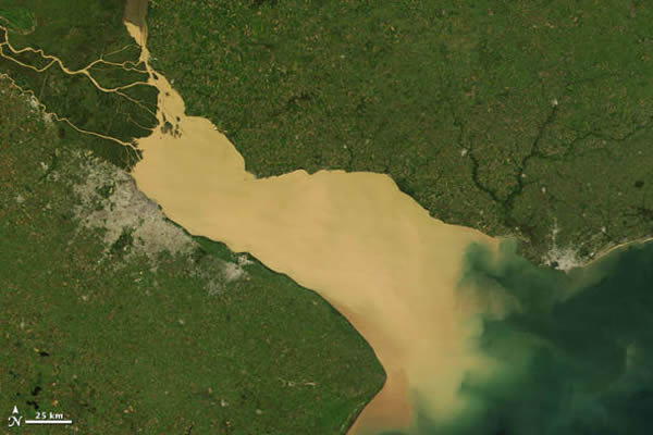 在这幅照片中,我们可以看到河口中淤积了沉重的黄褐色沉积物,其原因是暴风雨导致巴拉那河上游农业区表层土流失,之后再流入拉普拉塔河。