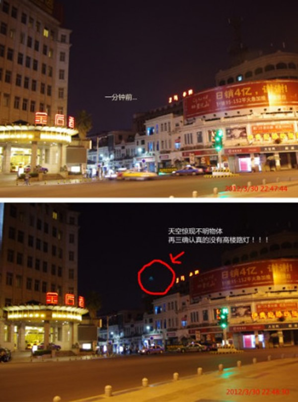 回放图片里22点47分拍摄的中山路文化宫路口夜景一切正常,而22点48分的图片在漆黑的天空中出现了一个蓝绿色扇形亮光,貌似传说中的UFO,再往后的图片里,那亮光又消失了。