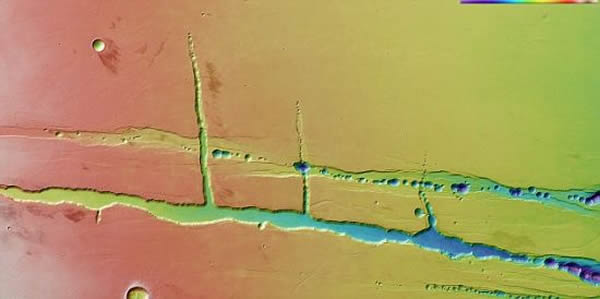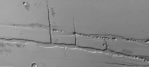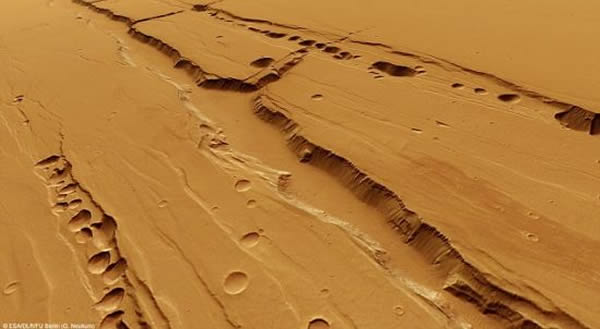 这些显示火星地下隧道的图像来自欧洲航天局火星“快车”号探测器,它们显示太阳系最大火山群的两翼有一连串坑链。这些照片拍自2011年6月22日,显示了火星塔尔西斯地区阿卡迪亚“塔拉克图斯链”的地形情况。该地区拥有许多巨大火山,包括由三座相连火山组成的塔尔西斯火山群等。在这些火山群的北部,坐落着亚拔山。无论从面积还是体积上来说,它都是太阳系中最大的火山群。