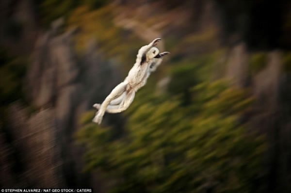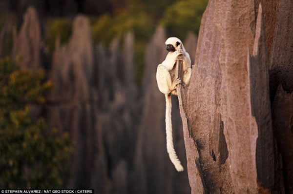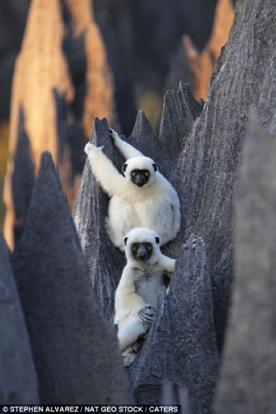 据摄影师称,“这是一次令人难以置信的拍摄之旅,在这里我们看到了雪白的狐猴白天在石林内觅食,犹如杂技演员一样在锋利的石林尖顶间凌空跳跃,这一切太惊险刺激了。”