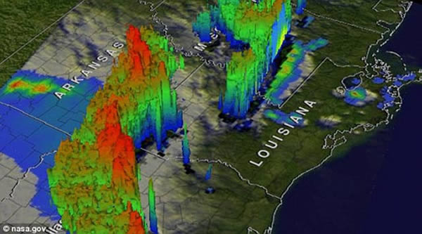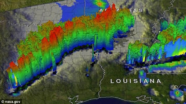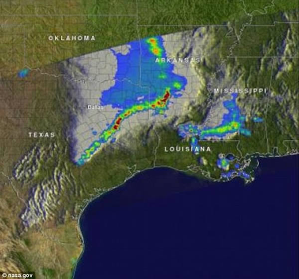 一场龙卷风在上周侵袭了德克萨斯州的部分地区,使这些地区受到了不同程度的破坏。近日,美国宇航局就于当地时间晚上八点三十分拍摄到了这场龙卷风的3D图片,它们从德克萨斯州的北部一直延伸到阿肯色州。