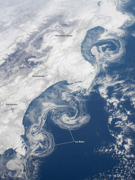 堪察加半岛东南部的海岸线很不规则,使来自西南方的堪察加海流在这里形成圆形涡流。在这幅照片的中央,我们可以看到浮冰衬托下的三个涡旋。这种涡流对远洋轮船非常危险。从ISS上看,这些浮冰可能会显得脆薄,但实际上它们中体积较小的冰块也有几米宽。照片右上角不是浮冰,也不是积雪,而是白云,这可以通过它们的高亮度和间断性来识别。