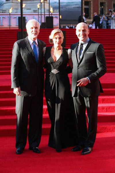 3月27日晚,伦敦皇家阿尔伯特音乐厅广场,詹姆斯-卡梅隆、凯特-温斯莱特和比利-赞恩出席3D版《泰坦尼克号》的全球首映会