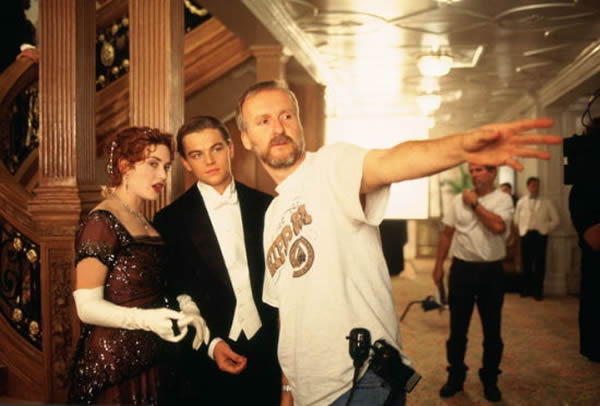 卡梅隆与两位主演凯特-温斯莱特和莱昂纳多-迪卡普里奥在《泰坦尼克 号》的拍摄现场。当年不到20岁的两位演员,凭借该片一举成名。如今,两人都已是好莱坞的一线巨星