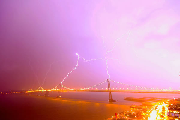 闪电击中海湾大桥瞬间