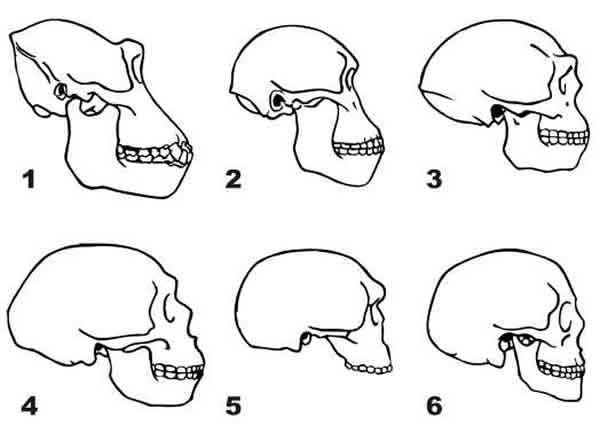 从猿到人脑量的变化。a猩猩 b南方古猿 c直立人 d尼安德特人 e古老型智人 f晚期智人