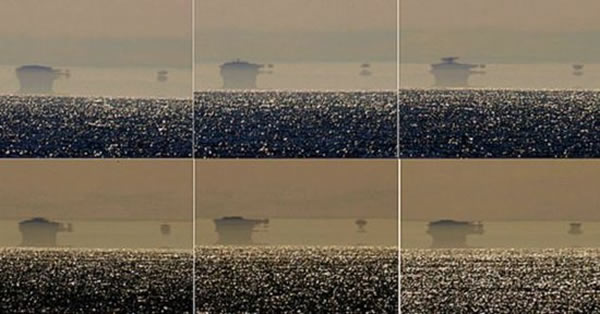 其产生的原因是光线通过空气中的逆温层,该现象在意大利语中被称为“法达摩加纳 (Fata Morgana)”,传说中亚瑟王的女巫使用巫术在天空中显现出神秘的城堡来用诱惑出海的水手。这种奇观较为罕见,但在美国的太平洋沿岸就发生过此类“光学幻象”。发生“复杂蜃景”现象的地方,光线出现扭曲,并将显现的物体拉伸或者堆叠,如果对象是一块巨大的冰山,就能将其隐藏起来。在船上的观测员角度观看,由于冷暖空气的交锋引发光线扭曲可使得远处的物体变得更大或者在不同的位置出现,形成一个幻象。