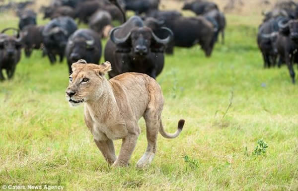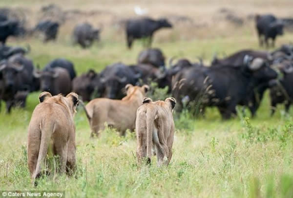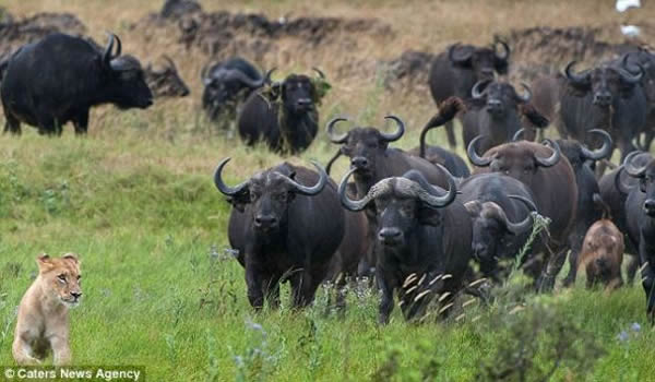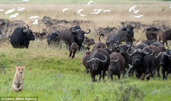 一群骄傲自大的狮子跟踪水牛数小时后,瞅准时机缓慢靠近,准备实施屠杀计划。但这些早已成为猎杀目标的水牛们并不打算不战而降,而是开始反击,击退了凶残的狮子。一位野生动物摄影师刚好拍下了这个令人不可思议的场面。