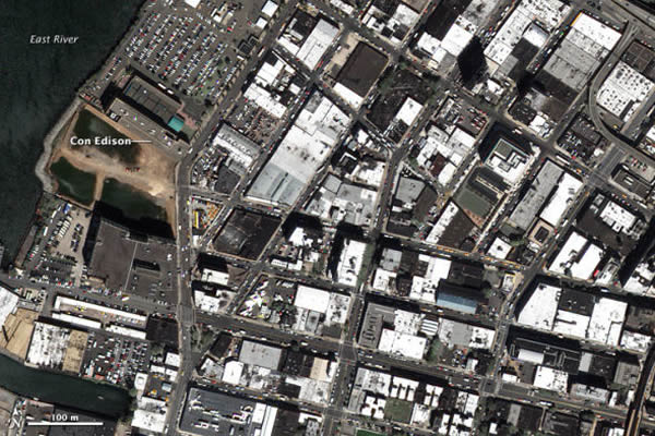 上面的这幅照片是数字地球公司(DigitalGlobe)的WorldView-2卫星于2010年9月15日拍摄的,显示了纽约皇后区的景象。从太空看,纽约皇后区仿佛一块黑布,上面缀着白色或其他颜色的屋顶。照片下面的曲线图是根据来自哥伦比亚大学和美国宇航局戈达德空间研究所提供的数据绘制的,显示了2010年8月初纽约皇后区不同颜色屋顶的表面温度。