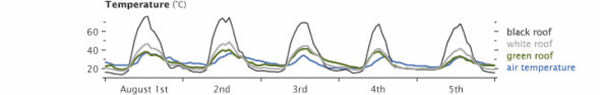 在最近的一项研究中,加芬和他的同事比较了黑色、白色和“绿色(植被)”屋顶的表面温度。他们发现,黑色的屋顶的温度可以比绿色或白色的屋顶高30°C。用植物覆盖屋顶是应对热岛效应的最好办法,因为它不但创造凉荫,而且湿润空气。
