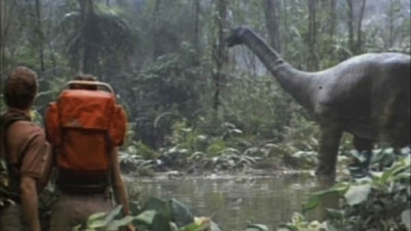 这是1985年电影《小恐龙历险记》中的剧照,一位古生物学家和她的丈夫在非洲丛林中发现了一只雌性迷惑龙和她的宝宝