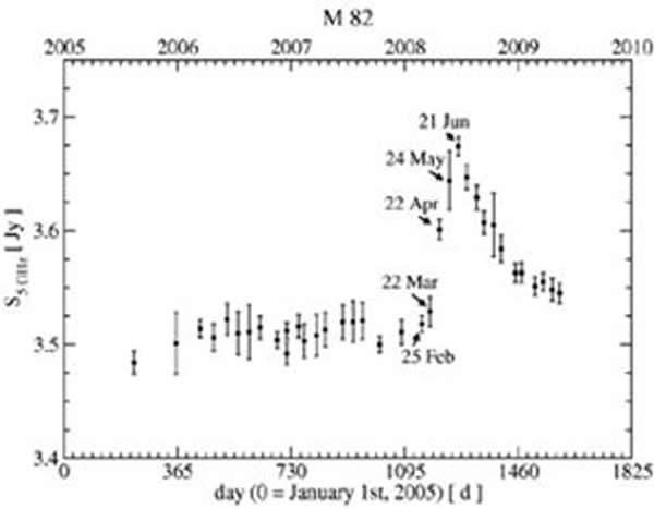 乌鲁木齐天文站刘祥研究员与德国马普射电所合作主持的观测研究项目,利用乌鲁木齐天文站25米射电望远镜进行河外星系射电流量监测中发现了星系M82中的一个射电超新星爆发(附图),该项目组博士研究生Marchili等撰写的论文《The radio lightcurve of SN2008iz in M82 revealed by Urumqi observations》于2010年1月15日在著名天文杂志《Astronomy and Astrophysics》上发表,并被该杂志评为亮点文章。该杂志配发的点评说:“射电超新星爆发是有趣但很少被发现的,能探测到它们爆发时的完整光变曲线是很不平常的,此亮点论文就提供了这样的光变曲线。作者还通过光变曲线获得了该超新星爆发的前身星的质量损失率,辐射区的磁场,爆发日期,膨胀壳层的速率等信息。”