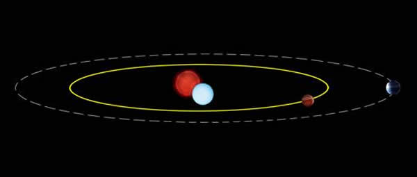 钱声帮研究员等利用云南天文台的1米望远镜和阿根廷的2.15米望远镜对这颗双星进行监测,结合前人的观测发现它的食光变信号到达地球的时间呈现出变幅为6.1秒的周期性变化,并且推断出还存在第二个小变幅的周期性变化。这个小变幅的周期性变化揭示了系统中存在一颗绕双星转动的类木行星。详细的计算表明它的最小质量为2.3倍木星,绕转周期为7.9年。这颗类木行星到中心双星的距离约为3.3个天文单位(1天文单位定义为地球到太阳的平均距离),相当于太阳系内小行星带到太阳的平均距离。第二个小变幅周期性变化的存在表明该系统中还有一颗质量约为2.5倍木星的系外行星(如图所示)。在这两颗行星星球上不仅能观看到一个红一个蓝白的两个“太阳”高挂天空,而且还能近距离感受到B型亚矮星的快速脉动!这两颗系外行星目前已被系外行星百科全书网站收录(The Extrasolar Planets Encyclopaedia)。