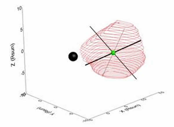 黑色球体为太阳位置,红色曲线区域为CME的三维空间形态,绿色球体为计算的CME的几何中心,三条黑线为CME三维几何体的三个主轴。