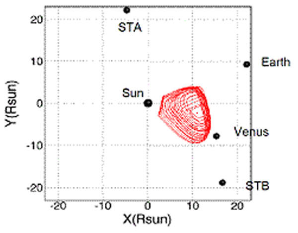 从太阳北极点上方看到的三维CME在太阳赤道面上的投影,可用来判断CME传播方向.图中显示其相对于STEREO两颗卫星STA,STB, 金星, 地球视线方向的空间位置。