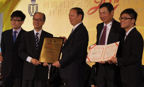 陈繁昌(左二)、张建东(左四)接受鲁春林(中)颁发的「港科大星」命名证书和铜匾