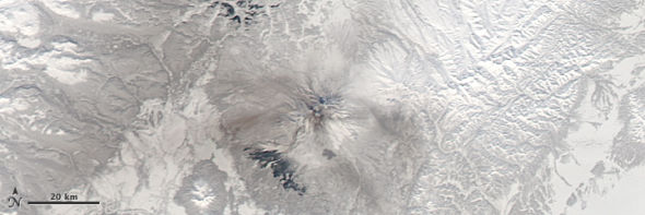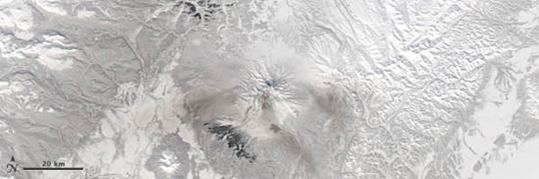 俄罗斯堪察加半岛上的思威纳驰火山是世界上最活跃的活火山之一。2012年4月的前三个星期,思威纳驰火山的短暂爆发在周围雪地上留下了火山灰的辐射状条纹。