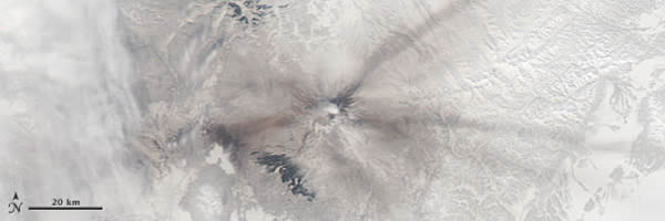 据堪察加火山应急响应小组(KVERT)报道,这些火山条纹延绵120公里。在4月4日拍摄的照片中,可以看见一团小灰云,在4月22日拍下的照片中,还可以看见一股由蒸汽和其他火山气体构成的烟柱。