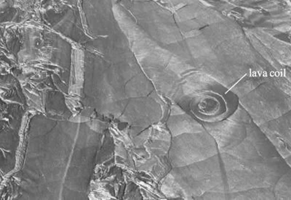 这是1974年的的夏威夷pahoehoe熔岩流表面上的的熔岩线圈(直径10米)。