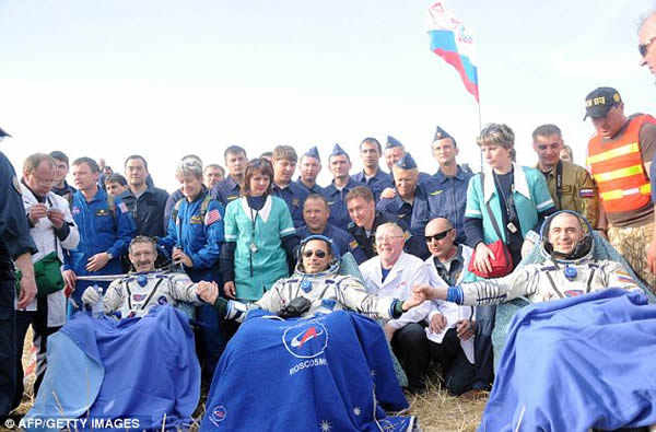美国宇航局直播视频画面显示,俄罗斯宇航员施卡普列罗夫(Anton Shkaplerov)、伊凡尼辛(Anatoly Ivanishin)与美国宇航局宇航员丹·布班克(Dan Burbank),在格林尼治标准时间上午11点45分(北京时间晚上7点45分)回到地球。