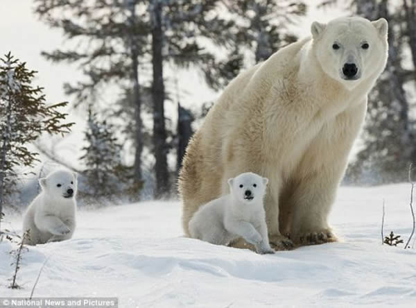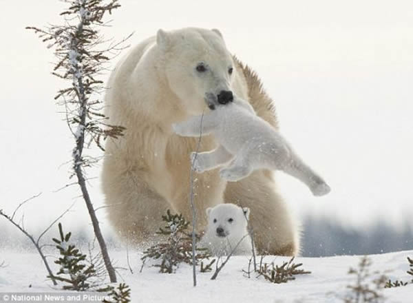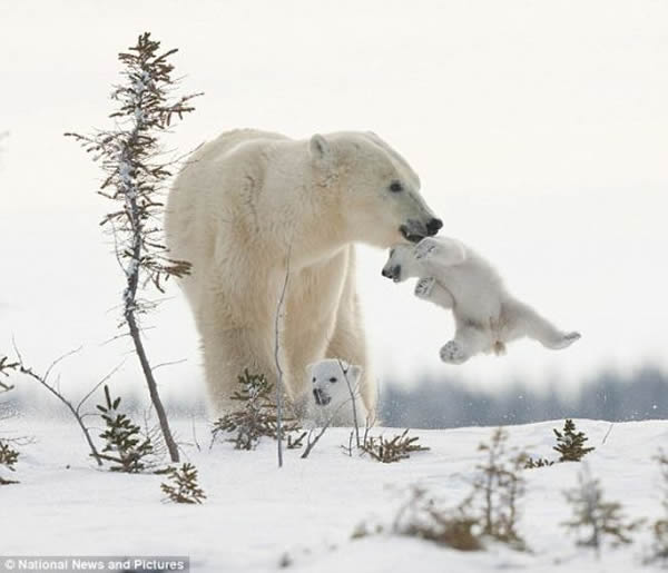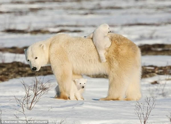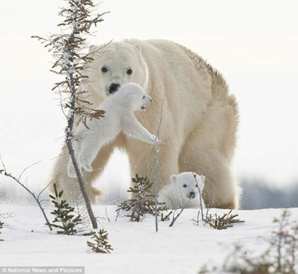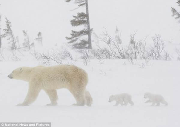 在加拿大的野外,美国著名野生动物摄影师托马斯-曼格森拍摄了一组照片,展现北极熊母子雪地上赶路的精彩瞬间。照片呈现的景象绝对能够感动天底下的所有母亲。当时,北极熊妈妈带着两个孩子离开洞穴,前往35英里(约合56公里)外的哈得逊湾海冰区觅食。虽然天气寒冷加之长途跋涉,两个小家伙还是不改顽皮的本性,不时和妈妈玩上一会,而后再老老实实地跟在妈妈后面,继续赶路。