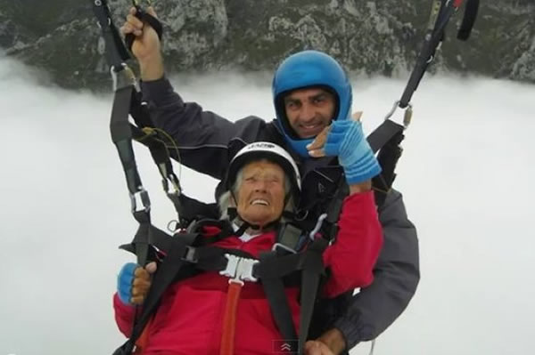 英104岁老人完成双人滑翔伞跳伞