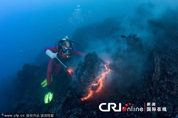美国夏威夷海底潜水员用双手触碰1000摄氏度的熔岩