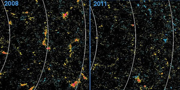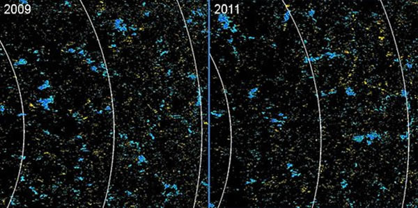 这两张日出卫星获取的影像展示了2009年(左图)与2011年(右图)太阳南半球的磁场。大型蓝色斑块表示具有正极性的区域,它们在2011年仍旧存在。