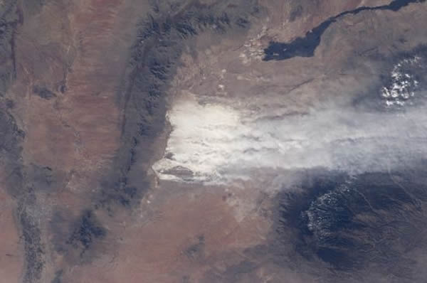 从距地球245英里(约合394公里)的国际空间站上,宇航员拍摄了一幅照片,展现飘浮在萨克拉门托山上空超过4000英尺(约合1219米)的雪白色羽状尘带,长度超过75英里(约合120公里)。
