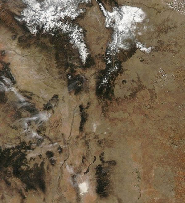 同一日,美国宇航局Terra卫星的中分辨率成像光谱仪也拍摄了一幅照片,展现羽状雪白尘带。在风的吹动下,白色尘带穿过萨克拉门托山和圣安德烈斯山间一个海拔较低的区域,高度比北部和南部的顶峰低大约2400英尺(约合731米)。